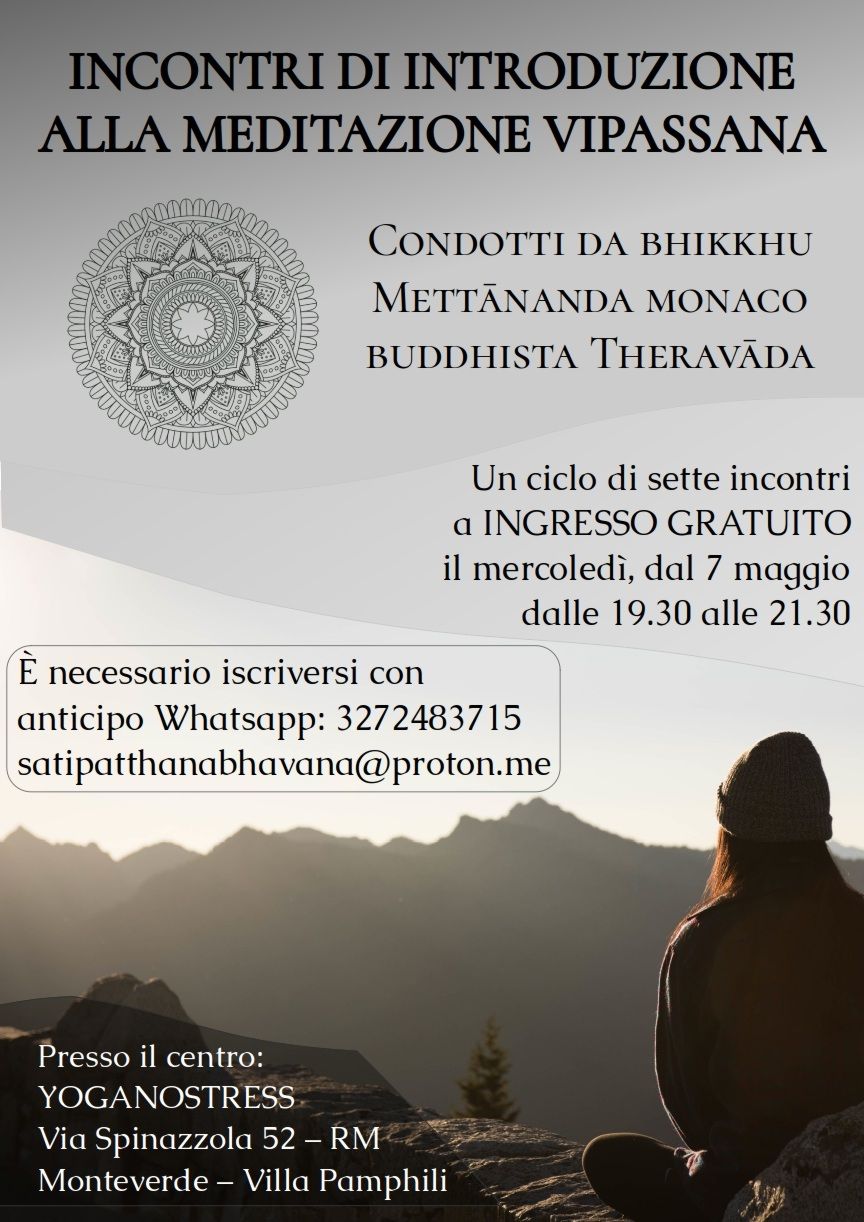 A partire dal 7 maggio, Bhante Mettānanda terrà un evento speciale settimanale ogni mercoledì alle 19.30 dedicato alla meditazione Vipassana a Monteverde, presso il Centro Yoganostress in via Vittorio Spinazzola 52, vicino Villa Pamphili. Questo evento rappresenta un’opportunità unica per coloro che sono interessati a esplorare o approfondire la pratica della meditazione sotto la guida di un maestro con una vasta esperienza e profonda comprensione del cammino spirituale.