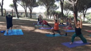 La lezione di yoga all’aperto a Villa Pamphili è stata ripresa per andare in onda in TV.